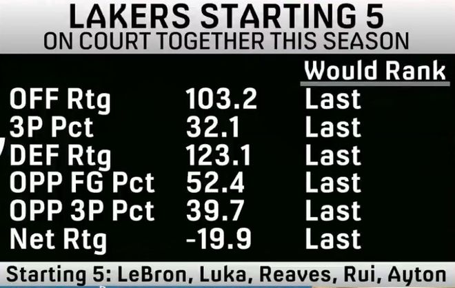 數(shù)據(jù)顯示,湖人常規(guī)首發(fā)(詹姆斯、東契奇、里夫斯、八村壘和艾頓)本賽季同場時(shí)的進(jìn)攻效率是103.2,三分命中率是32.1%,防守效率是123.1,對手投籃命中率52.4%,對手三分命中率39.7%,百回合輸分19.9分,這六項(xiàng)數(shù)據(jù)全部排在隊(duì)內(nèi)所有首發(fā)中墊底。