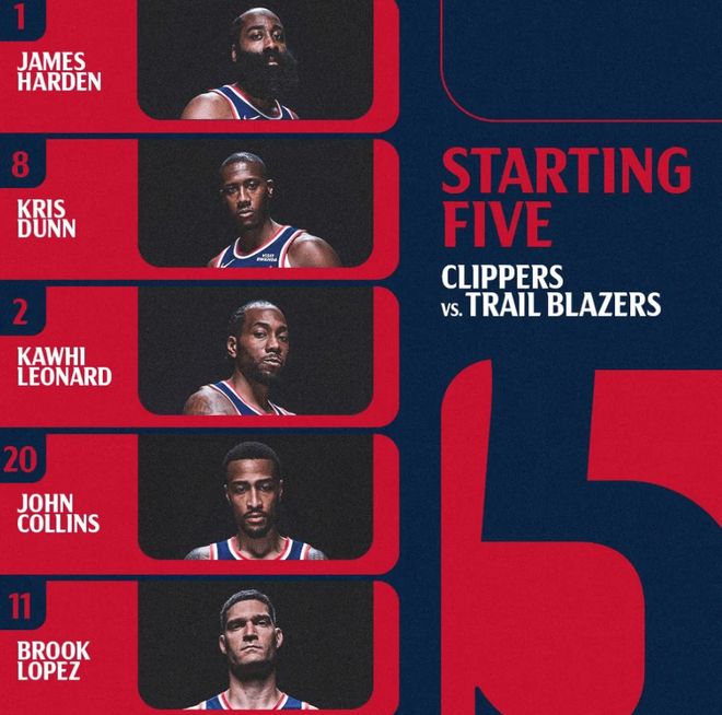首發(fā)陣容方面,快船隊這邊,祖巴茨、比爾缺陣,泰倫盧教練排出的最新首發(fā)五人組為:詹姆斯-哈登、克里斯-鄧恩、科懷-倫納德、約翰-科林斯、大洛佩茲;開拓者隊這邊,亨德森、格蘭特、霍勒迪、利拉德四大主力缺陣,首發(fā)陣容則為:夏普、卡馬拉、默里、阿夫迪亞、克林根。