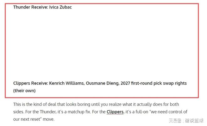 本賽季雙方境遇還是天差地別,雷霆雖然這段時(shí)間出現(xiàn)下滑,但依然穩(wěn)居聯(lián)盟榜首,快船即便略有反彈,卻需要為附加賽資格而戰(zhàn)。媒體FW趁這個(gè)機(jī)會(huì),策劃快船再次跟雷霆進(jìn)行交易,可以送中鋒祖巴茨去俄城,換來(lái)兩替補(bǔ)肯里奇-威廉姆斯、奧斯曼-迪昂再加上2027年首輪互換權(quán)。