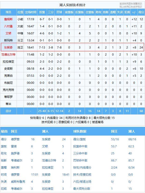 國王:德羅贊16分1板2助、威斯布魯克9分4板2助、施羅德7分1板3助、雷諾6分6板1助、蒙克6分1板、阿丘瓦5分1板1助、埃利斯2分、克利福德2分、考德威爾2板2斷