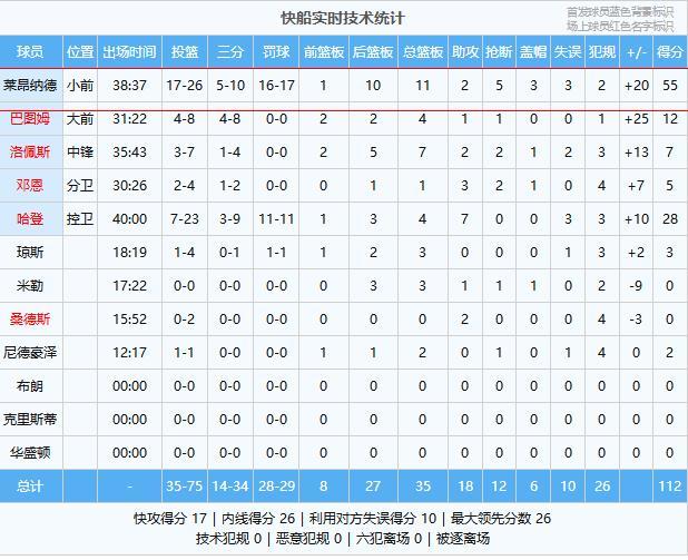 快船:萊昂納德55分11板2助5斷3帽、哈登28分4板7助、巴圖姆12分4板1助、洛佩斯7分7板2助2斷、鄧恩5分1板3助2斷、瓊斯3分3板、尼德豪澤2分2板、米勒3板1助、桑德斯2助