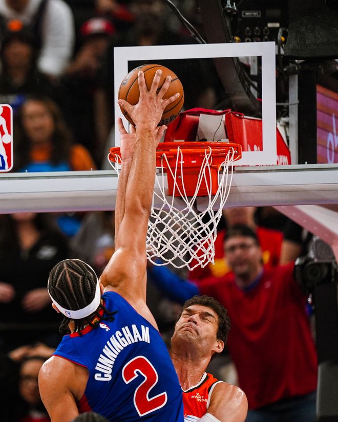 活塞隊首發(fā)陣容:坎寧安、羅賓遜、湯普森、哈里斯、杜倫