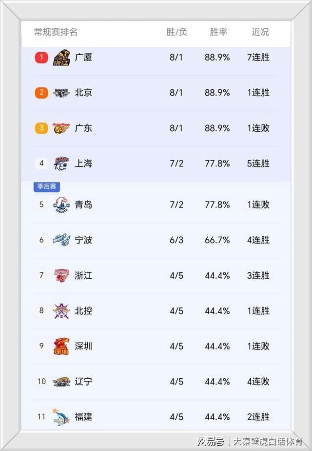 ③、廣東男籃賽季不敗金身告破,8勝1負(fù)排名第三;