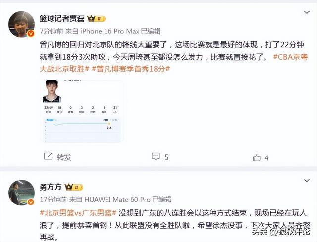籃球記者賈磊發(fā)文點評:“曾凡博的回歸對北京隊的鋒線太重要了,這場比賽就是最好的體現(xiàn),打了22分鐘就拿到18分3次助攻,今天周琦甚至都沒怎么發(fā)力,比賽就直接花了?!?/p>