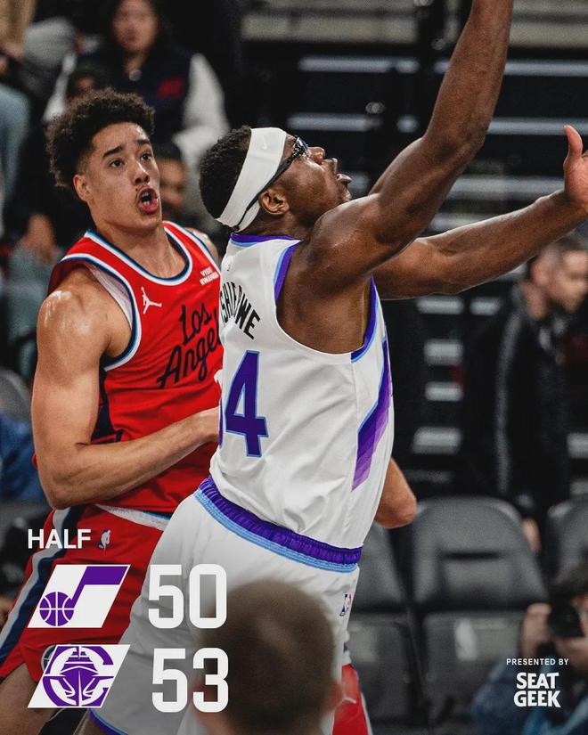 爵士三分也不準(zhǔn),上半場只有14中2,但是三分出手?jǐn)?shù)比快船少了10次。內(nèi)線得分爵士36-16完爆快船,半場戰(zhàn)罷,快船53-50只領(lǐng)先3分。爵士9人休戰(zhàn),快船第二節(jié)輸了11分……李凱爾8中7,半場砍下16分8籃板,正負(fù)值+18!