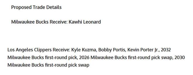 快船得到:庫茲馬+波蒂斯+小凱文波特+2032年雄鹿首輪+2026年雄鹿首輪互換+2030年首輪互換。