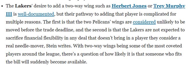 Stein表示,湖人想要引進(jìn)赫伯特-瓊斯或特雷-墨菲三世這類攻防兼?zhèn)涞膫?cè)翼球員,這一意向早已見諸報(bào)道,但他們完成這筆引援的難度不小,原因是多方面的。其一,鵜鶘隊(duì)的這兩位側(cè)翼球員在交易截止日前被交易的可能性不大;其二,湖人方面不打算在任何交易中犧牲薪資靈活性,除非能換來他們認(rèn)為能真正改變戰(zhàn)局的球員。