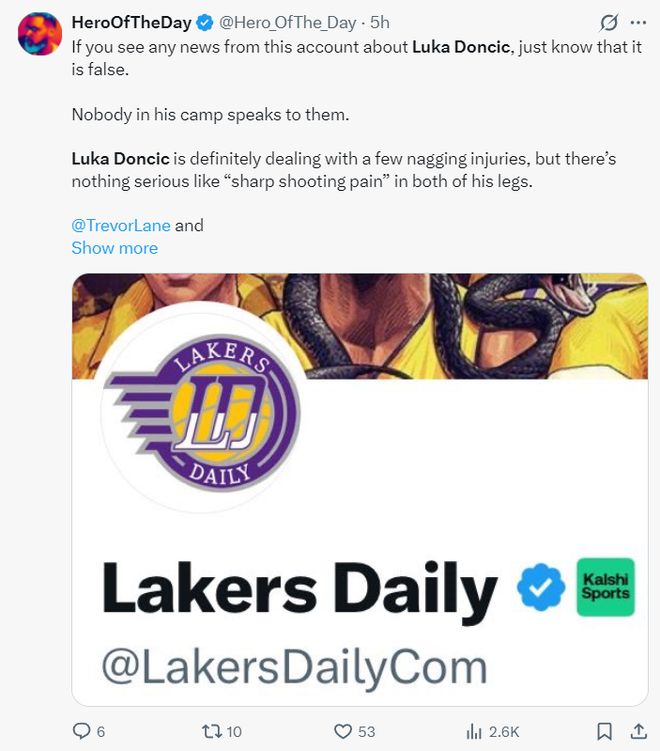 在這場(chǎng)比賽之前,著名的詹黑媒體HeroOfTheDay(下稱(chēng)HOTD)炮轟湖人媒體《Lakers Daily》,他表示:在這個(gè)賬號(hào)上看不到任何關(guān)于東契奇的消息,他們陣營(yíng)里不愿意承認(rèn)很多真相,東契奇確實(shí)存在一些持續(xù)性的傷病,但他沒(méi)有出現(xiàn)那種雙腿抽搐的嚴(yán)重狀態(tài),他還是帶傷出戰(zhàn)。