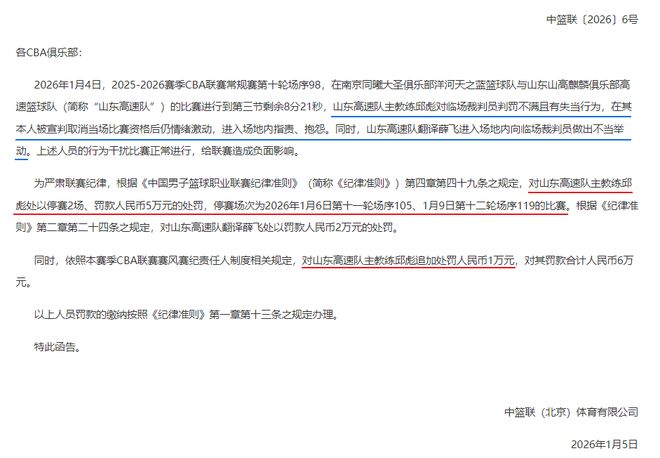 北京時(shí)間1月5日深夜,CBA公司突然發(fā)布公告,對(duì)山東男籃主教練邱彪和翻譯薛飛開出罰單。原文寫道:“對(duì)山東高速隊(duì)主教練邱彪處以停賽2場、罰款人民幣5萬元的處罰,停賽場次為2026年1月6日第十一輪場序105、1月9日第十二輪場序119的比賽。”