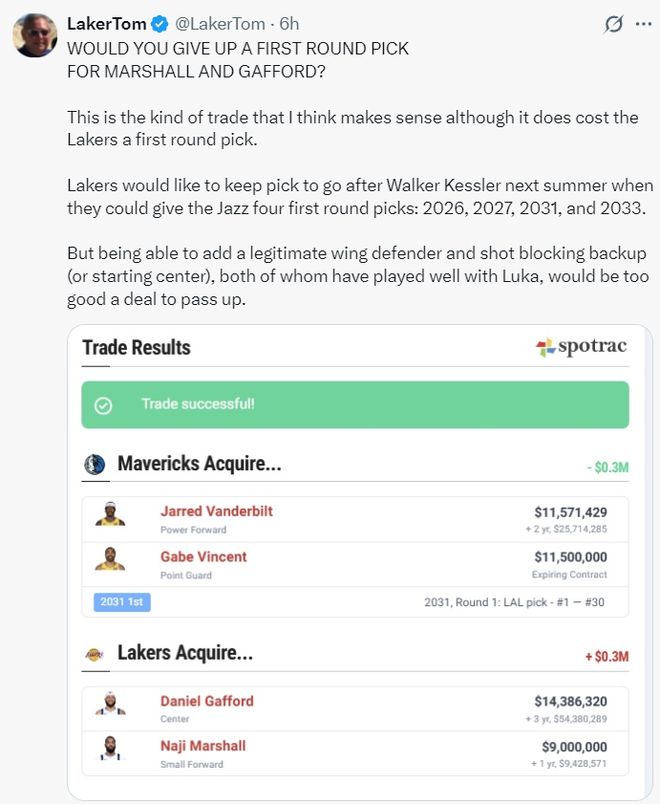 湖人媒體Laker Tom寫道:你們愿意放棄一個首輪簽來換馬紹爾、加福德嗎?這筆交易我認(rèn)為是合理的,盡管湖人會失去一個首輪簽。