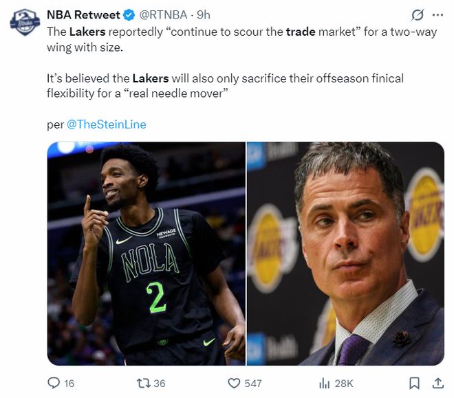 NBA名記馬克-斯坦恩在最新的報道中透露,湖人繼續(xù)在交易市場上尋找一位身材高大且攻防俱佳的側(cè)翼球員。湖人只愿意為了這種攻防兼?zhèn)涞膫?cè)翼球員(真正能改變比賽局面的球員)而犧牲休賽期的財務(wù)靈活性/未來資產(chǎn)。