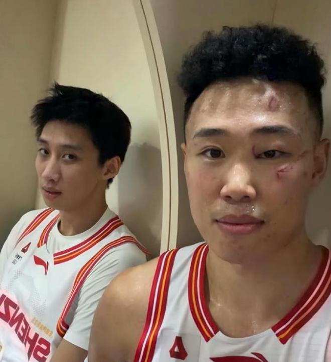 直到第二節(jié)最后階段,賀希寧才重新上場。此時的賀希寧,右眼紅腫,額頭上、臉上,特別是右眼左右,都有明顯的劃痕,右眼也是腫的只剩一條縫,對此,他在賽后采訪時說:“現(xiàn)場頭很暈”??梢?,受傷對他的影響有多大。