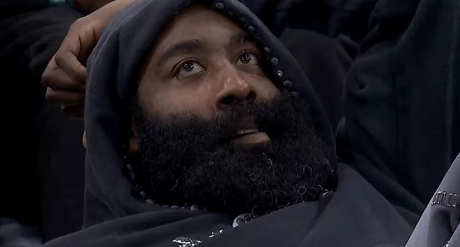 快船后場核心哈登因為右肩酸疼缺席,他來到現(xiàn)場躺著觀看比賽。
