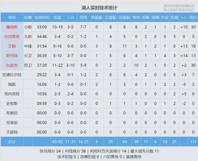 此役過(guò)后,湖人重返西部第三,勝場(chǎng)數(shù)和第四的掘金一樣,領(lǐng)先第五的火箭0.5個(gè)勝場(chǎng)!最后看看數(shù)據(jù),說(shuō)說(shuō)你的感受: