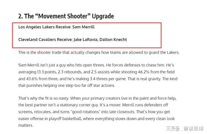 果然當(dāng)?shù)孛襟w又忍不住了,支招湖人交易來騎士后衛(wèi)薩姆-梅里爾,這本身沒啥問題,后者也確實(shí)可以幫到湖人。只不過從具體交易方案來看,湖人需要送走24歲前鋒拉拉維亞,這就不是很明智了,替補(bǔ)射手道爾頓-克內(nèi)克特則會(huì)當(dāng)添頭。