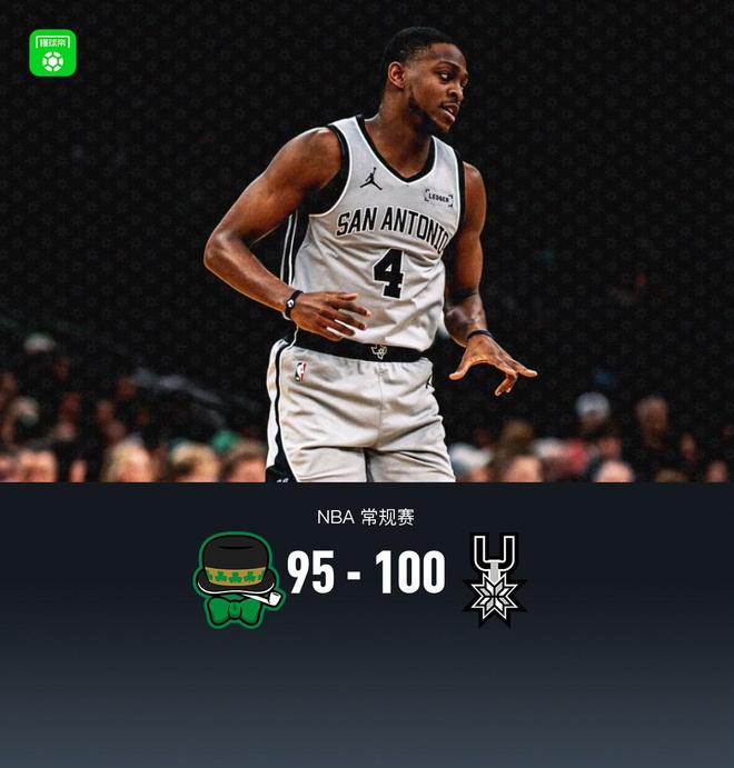 第四節(jié)凱爾特人德里克-懷特拿下9分,馬刺凱爾登-約翰遜拿下7分,最終凱爾特人95-100不敵馬刺