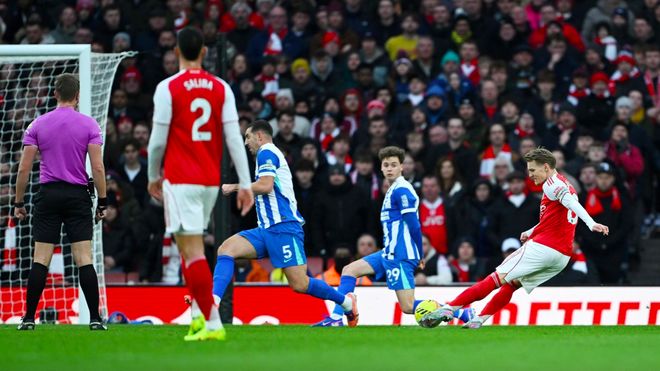 第14分鐘,阿森納中圈附近斷球,薩卡送出助攻,厄德高打近角得手,收獲了個人本賽季的首個進球。
