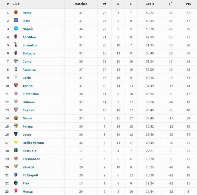 意甲2025年度積分榜:羅馬37場26勝82分居首,國米次席