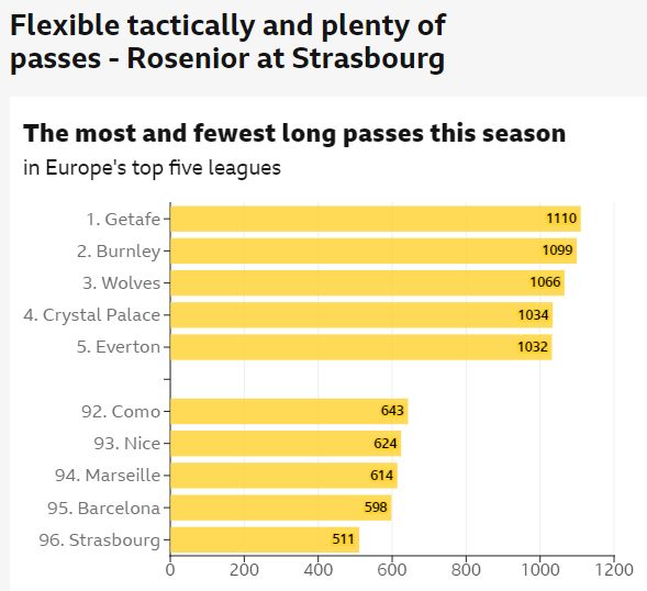 事實上,斯特拉斯堡只有511次長傳,低于其他五大聯(lián)賽球隊,排名倒數(shù)第二位的巴薩則有598次長傳,切爾西的長傳次數(shù)則高達925次。