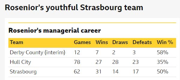 2024年7月,羅西尼爾正式執(zhí)教斯特拉斯堡,隨即率領(lǐng)球隊在2024-25賽季排名法甲第7位,本賽季同樣排名法甲第7位。在本賽季的歐協(xié)聯(lián)小組賽里,斯特拉斯堡5勝1平保持不敗,以16分排名榜首。