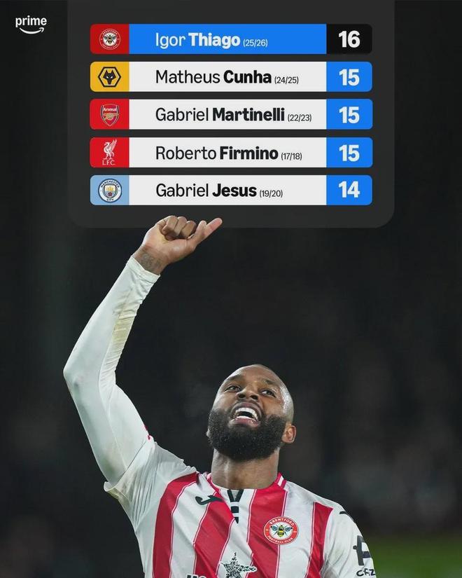 上輪英超比賽,布倫特福德客場4-2擊敗埃弗頓,伊戈爾-蒂亞戈上演帽子戲法,讓個人的賽季進球數(shù)達到了14球,距離巴西球員單賽季英超最多進球紀錄只差1球。本輪面對桑德蘭,伊戈爾-蒂亞戈依舊狀態(tài)火熱, 他在上下半場各入一球,直接將個人進球數(shù)據(jù)提升至16球。