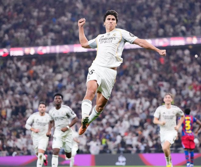 在上賽季的西超杯決賽,巴塞羅那5-2送給銀河戰(zhàn)艦一場恥辱性的失利問鼎冠軍,為了能夠?qū)崿F(xiàn)衛(wèi)冕的目標(biāo),弗里克此役也是毫無保留,祭出了433的體系,霍安加西亞鎮(zhèn)守龍門,巴爾德、加西亞、庫巴西和孔德構(gòu)筑后防,佩德里、德容和費(fèi)爾明坐鎮(zhèn)中場,拉菲尼亞、萊萬和亞馬爾組成進(jìn)攻三叉戟。