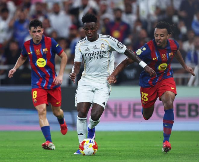 隨著主裁一聲哨響,兩支球隊(duì)就拉開架勢對攻,第34分鐘亞馬爾妙傳,可惜拉菲尼亞的單刀機(jī)會踢偏,不過2分鐘之后,他就彌補(bǔ)了遺憾,左路帶球殺入禁區(qū)后低射遠(yuǎn)角建功,幫助巴薩取得了1-0的領(lǐng)先,第47分鐘維尼修斯還以顏色,左路單挑巴薩整條后防,打入一記天秀進(jìn)球,終結(jié)長達(dá)3個(gè)月的進(jìn)球荒,將比分追至1平。