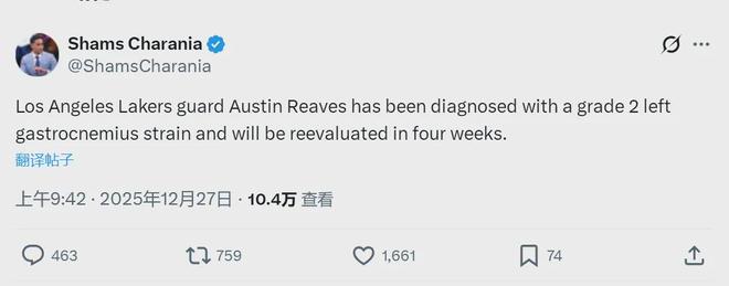 Shams:湖人后衛(wèi)里夫斯左腿腓腸肌二級(jí)拉傷,將在四周后復(fù)查